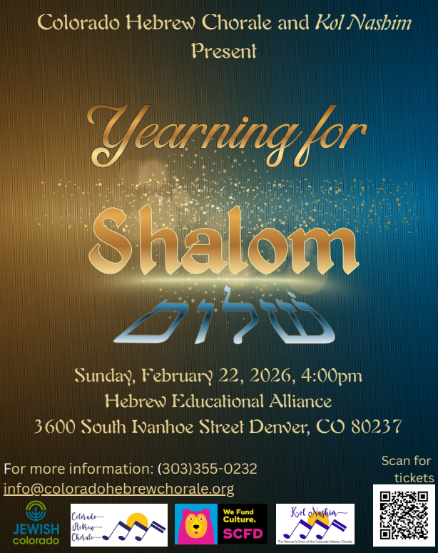 - Sunday, Feb. 22, 2026, 4 p.m., Hebrew Educational Alliance, 3600 South Ivanhoe Street, Denver CO 80237 – Razzle Dazzle: A Jewish Cabaret – featuring the Colorado Hebrew Chorale’s two choirs and special guests