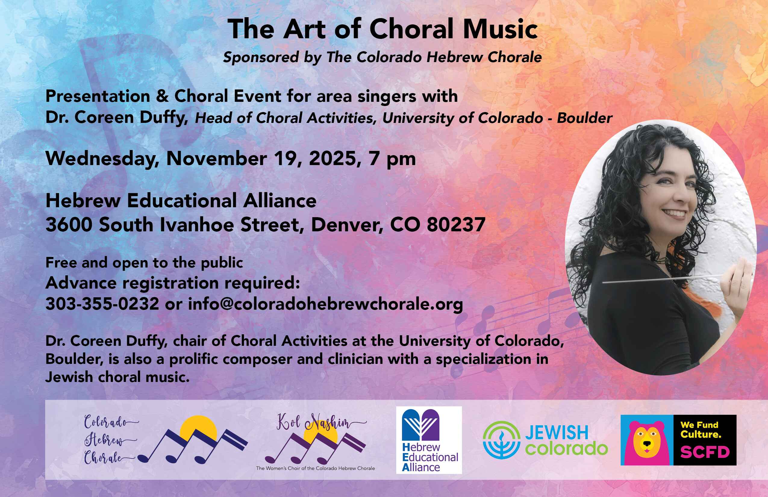 - Sunday, Feb. 22, 2026, 4 p.m., Hebrew Educational Alliance, 3600 South Ivanhoe Street, Denver CO 80237 – Razzle Dazzle: A Jewish Cabaret – featuring the Colorado Hebrew Chorale’s two choirs and special guests