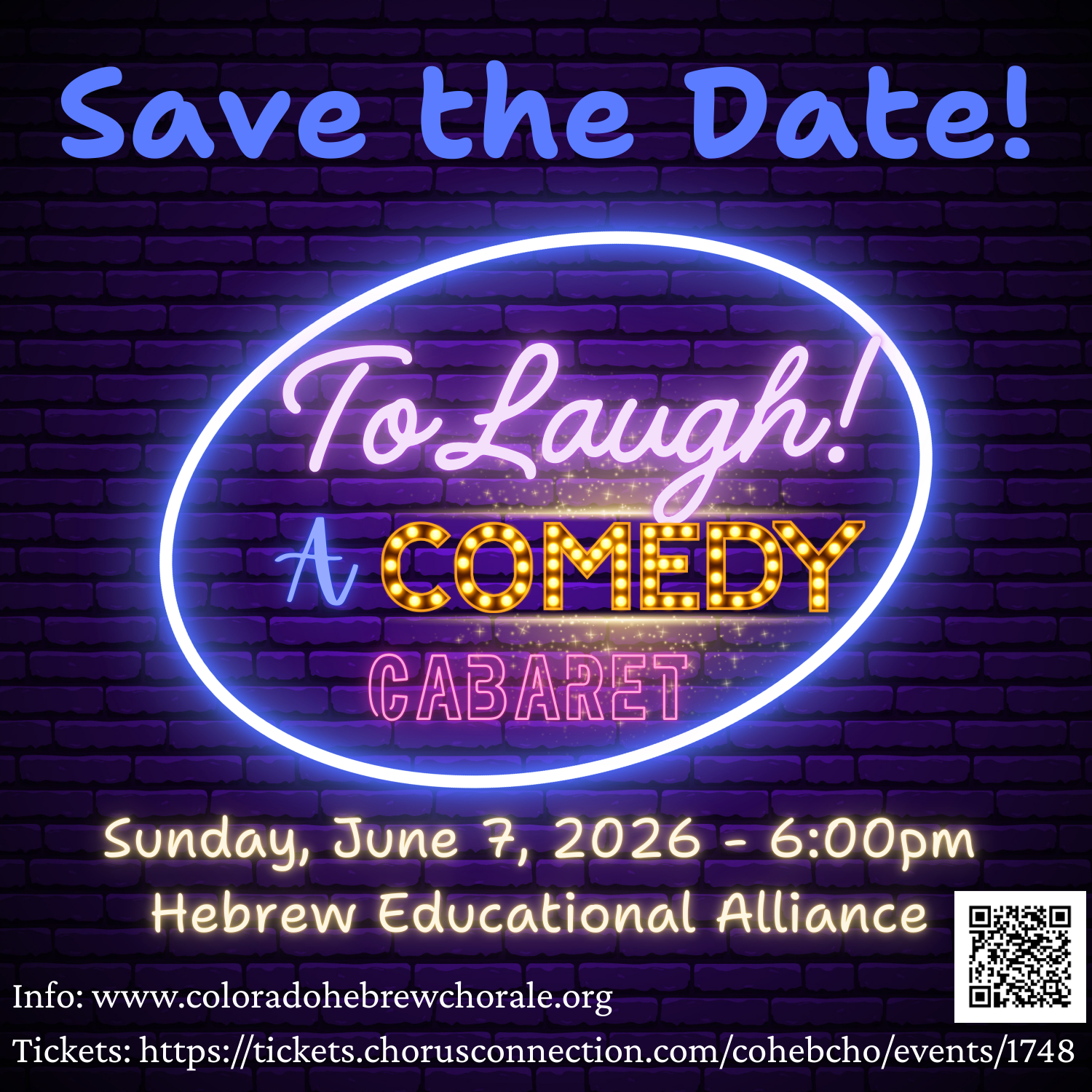 - Sun, June 7, 2026 – 6 p.m. To Laugh! Comedy Cabaret – Buy Tickets – Hebrew Educational Alliance, 3600 South Ivanhoe, Denver CO 80237