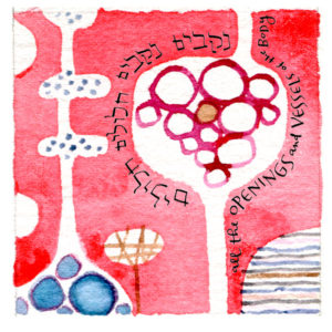 These mini-paintings, just a few inches square and completed in a single sitting, provided a solution. Risa has since found that the practice creates a quiet moment within the constant onslaught of media that has become the status quo. She also sometimes applies text–often from the daily blessings of the morning prayer service–to the daily abstract images, during or after the artmaking.